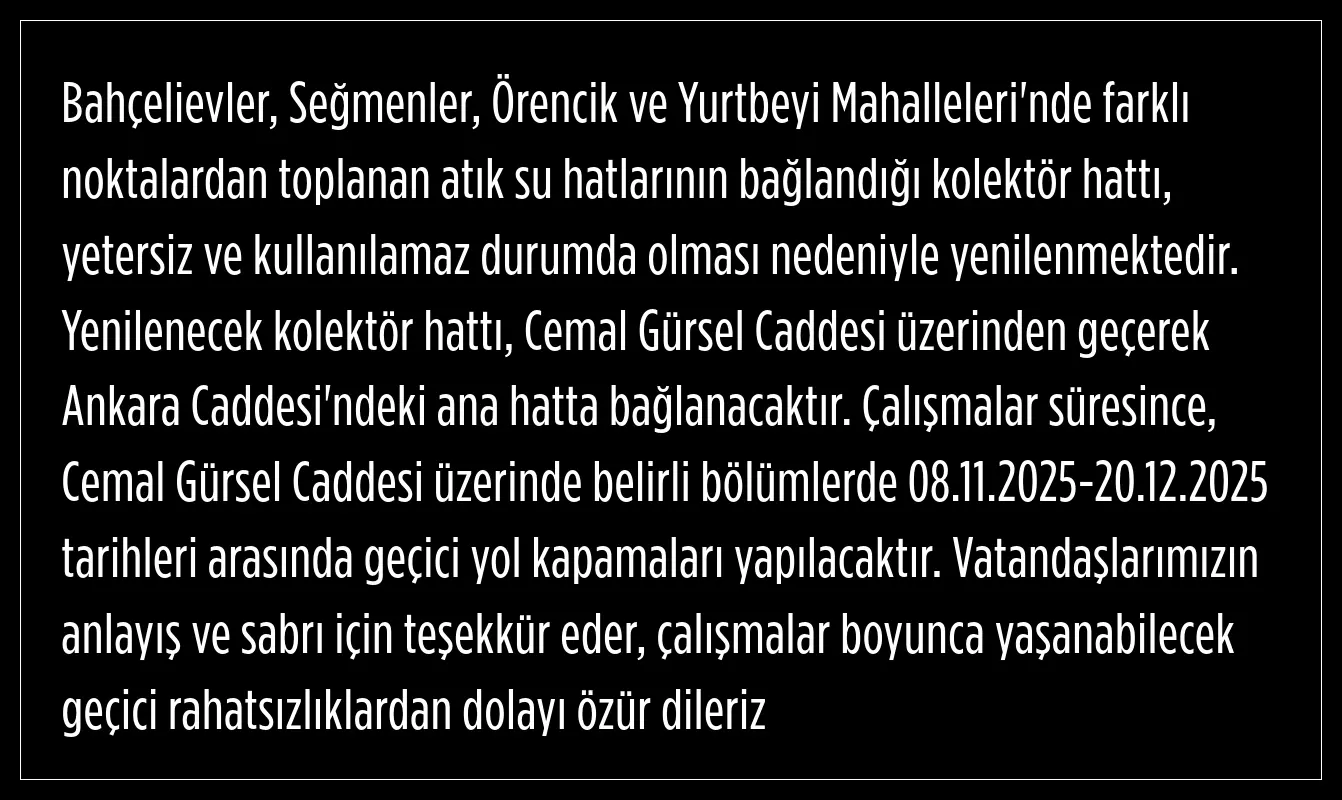 Çalışmalar süresince Cemal Gürsel Caddesi üzerinde belirli bölümlerde 08.11.2025-20.12.2025 tarihleri arasında geçici yol kapamalarının yapılacağı ifade edildi.
