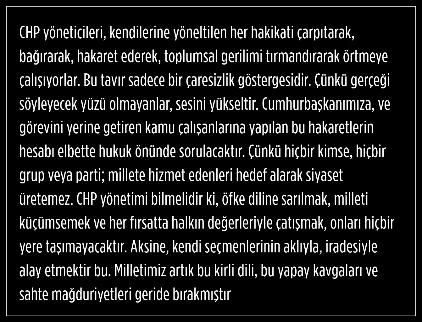 Usta, CHP yöneticilerinin kendilerine yöneltilen her hakikati çarpıtarak, bağırarak, hakaret ederek, toplumsal gerilimi tırmandırarak örtmeye çalıştığını söyleyerek, "Bu tavır sadece bir çaresizlik göstergesidir" dedi.