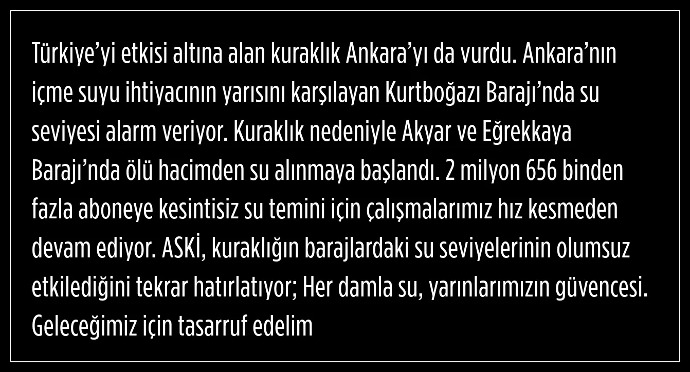 ASKİ, Ankaralılara seslenerek, "Her damla su, yarınlarımızın güvencesi. Geleceğimiz için tasarruf edelim" dedi.