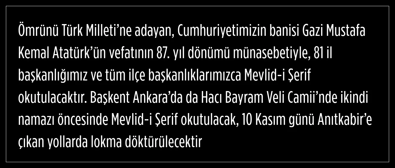 Dervişoğlu, Gazi Mustafa Kemal Atatürk’ün vefatının 87. yıl dönümü münasebetiyle 81 il başkanlıkları ve tüm ilçe başkanlıklarınca Mevlid-i Şerif okutulacağını ifade etti.