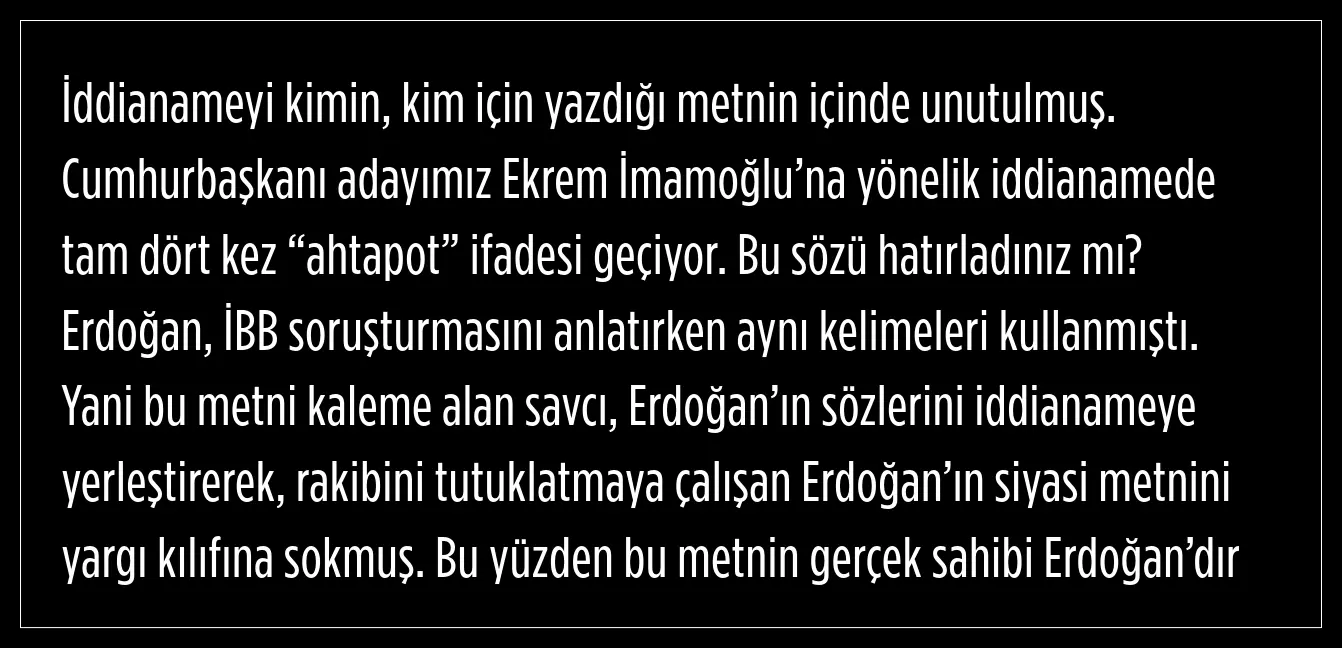 Emi, metin içerisinde Ekrem İmamoğlu’na yönelik tam dört kez “ahtapot” ifadesinin geçtiğini, Cumhurbaşkanı Recep Tayyip Erdoğan'ın İBB soruşturmasını anlatırken aynı kelimeleri kullandığını belirtti.