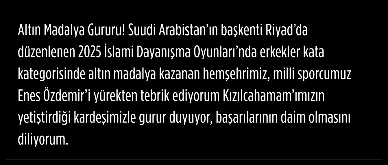 Kızılcahamam Belediye Başkanı Süleyman Acar, Suudi Arabistan’ın Riyad kentinde düzenlenen 2025 İslami Dayanışma Oyunları’nda erkekler kata kategorisinde altın madalya kazanan hemşehrisi Enes Özdemir’i tebrik etti.
