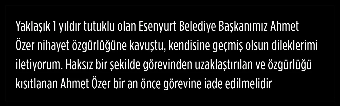 Deniz Demir, yaklaşık 1 yıldır tutuklu olan Esenyurt Belediye Başkanı Ahmet Özer'in nihayet özgürlüğüne kavuştuğunu ifade ederek, kendisine geçmiş olsun dileklerini ilettiğini belirtti.