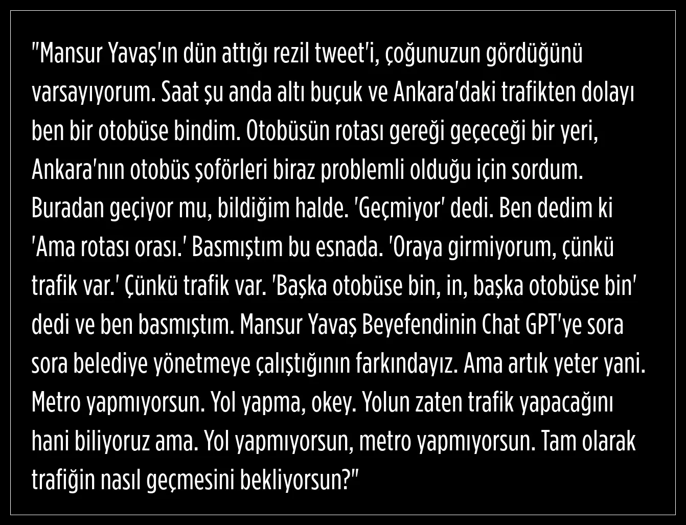“Mansur Yavaş Beyefendinin Chat GPT'ye sora sora belediye yönetmeye çalıştığının farkındayız. Ama artık yeter yani.” diyen genç kız, Mansur Yavaş’a “Yol yapmıyorsun, metro yapmıyorsun. Tam olarak trafiğin nasıl geçmesini bekliyorsun?" diye sordu.