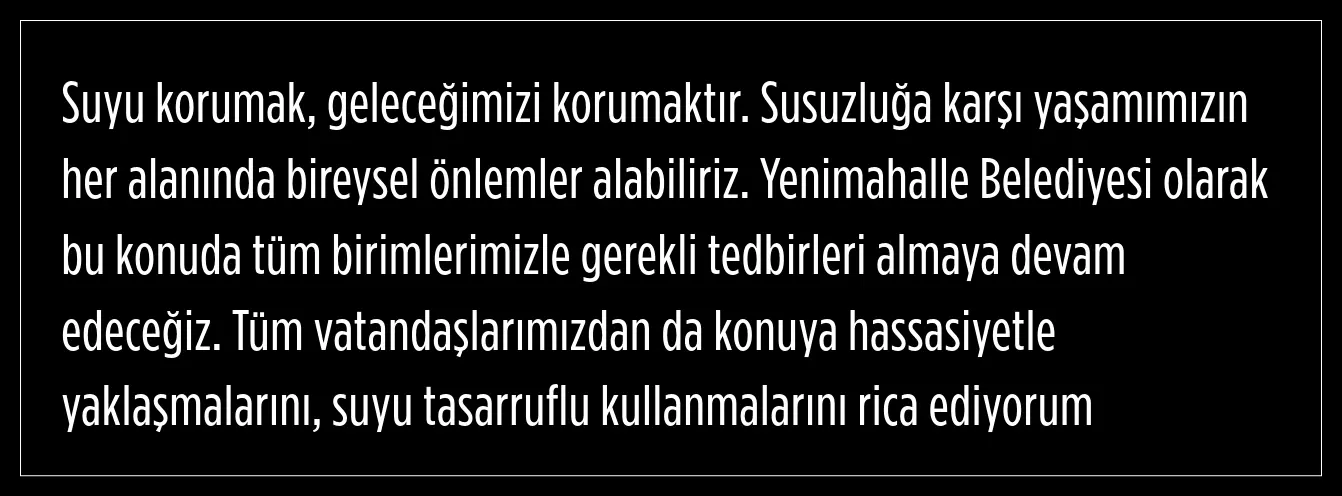 Yenimahalle Belediye Başkanı Fethi Yaşar, vatandaşlara seslenerek su kullanımı çağrısı yaptı. Yaşar, ''Suyu tasarruflu kullanmalarını rica ediyorum'' dedi.