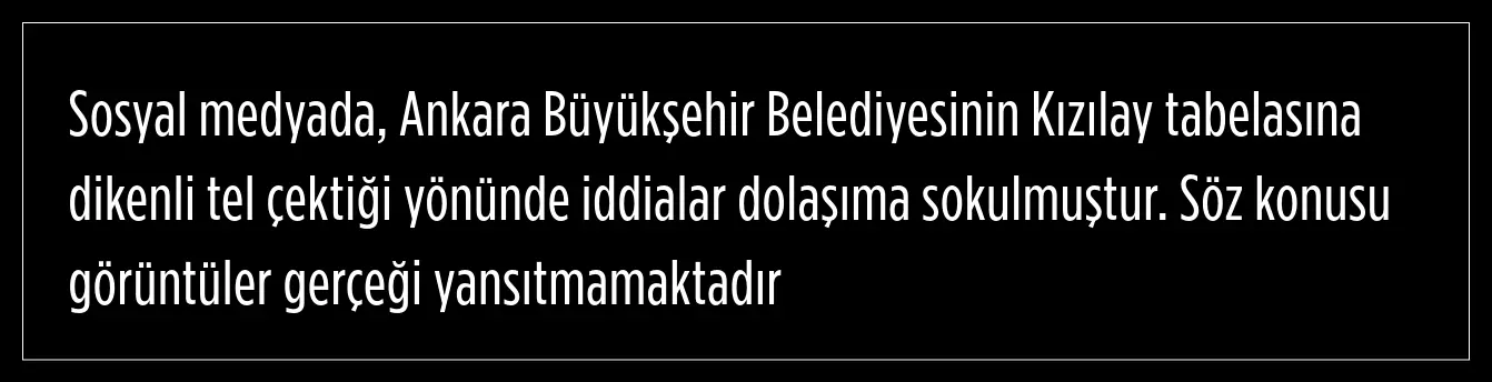 Açıklamada, Ankara Büyükşehir Belediyesinin Kızılay tabelasına dikenli tel çektiği yönünde iddiaların dolaşıma sokulduğu ve söz konusu görüntülerin gerçeği yansıtmadığı aktarıldı.
