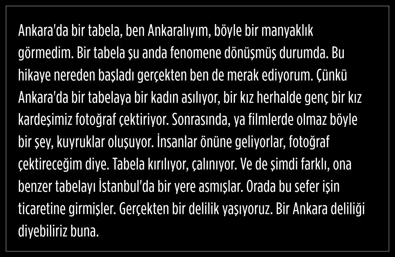 Özdemir, “Ankara’da bir tabelanın fenomene dönüşmesi akıl alır gibi değil” diyerek şehir ölçeğinde görülen sıra dışı ilgiyi sorguladı. Bir fotoğrafla büyüyen dalganın, film sahnelerini aratmadığını anlattı. Tabelanın kırılması ve çalınmasına dikkat çekerek, “Bir Ankara deliliği” ifadesini kullandı. İstanbul’da benzerlerinin ticarete konu olmasını eleştirdi.