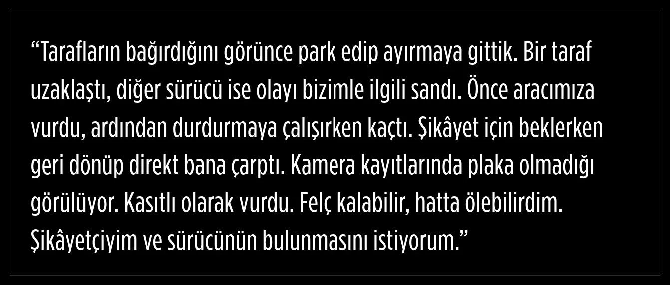 Taştanoğlu’nun avukatı Duru Özpınar Kaynak da olayın sıradan bir trafik kavgası olmadığını vurgulayarak, “Müvekkilim tamamen insani bir refleksle yardım etmek için durdu. Ancak sürücünün aracı hızla üzerine sürmesi cana kast anlamına geliyor. Bu bir kaza değil. Müvekkilin zıplaması daha ağır bir sonuç doğmasını engelledi. Şüphelinin yakalanıp adam öldürmeye teşebbüsten yargılanmasını talep ediyoruz.” dedi.