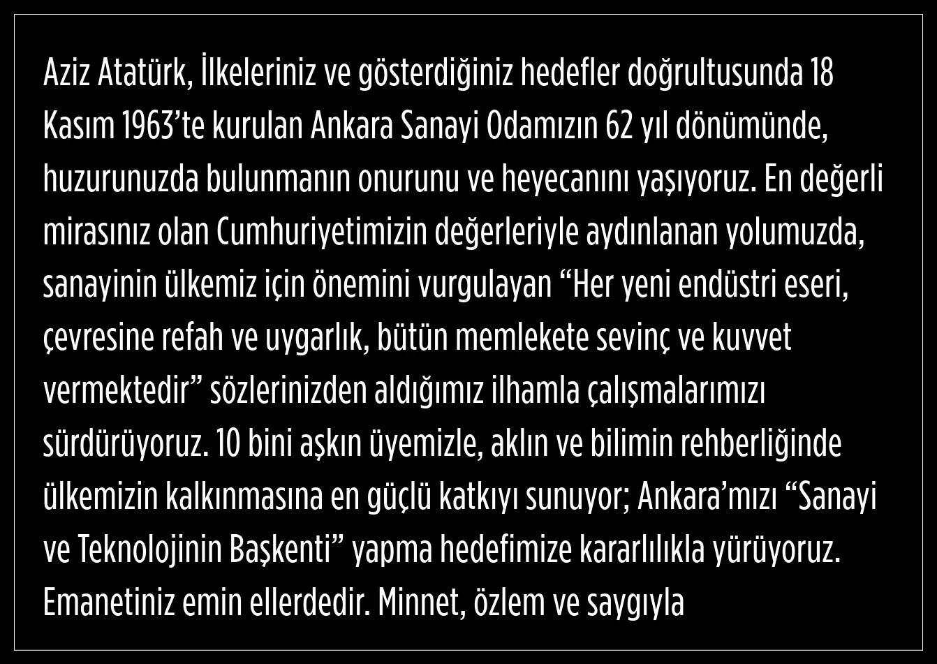 ASO Başkanı Seyit Ardıç, Misak-ı Milli Kulesi’nde Anıtkabir Özel Defteri’ne şunları yazdı: