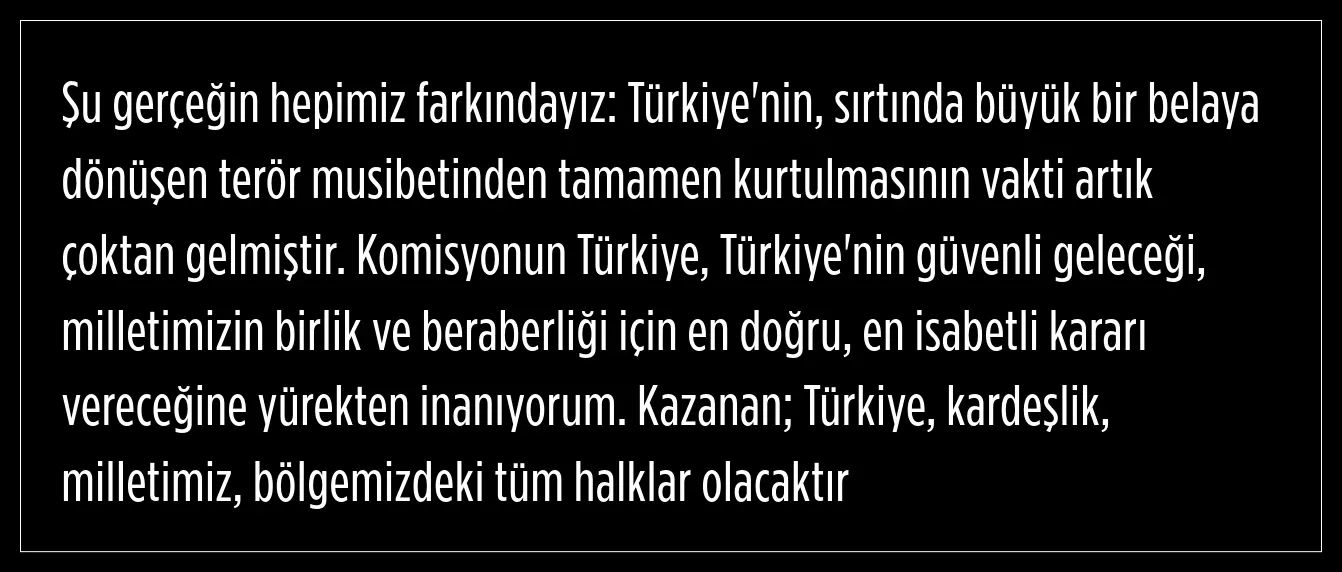 Konuşmasında Terörsüz Türkiye sürecine de değinen Cumhurbaşkanı Recep Tayyip Erdoğan, Terörsüz Türkiye sürecinin gayet olumlu ilerlemeler kaydettiğini, Milli Dayanışma, Kardeşlik ve Demokrasi Komisyonu'nun kurulmasıyla sürecin çok farklı bir ivme yakaladığını belirtti. Komisyonun, hedef birliği içerisinde olduğunu belirten Erdoğan, "Komisyonun beraberliğimize katkılarını takdir ediyorum" dedi.
