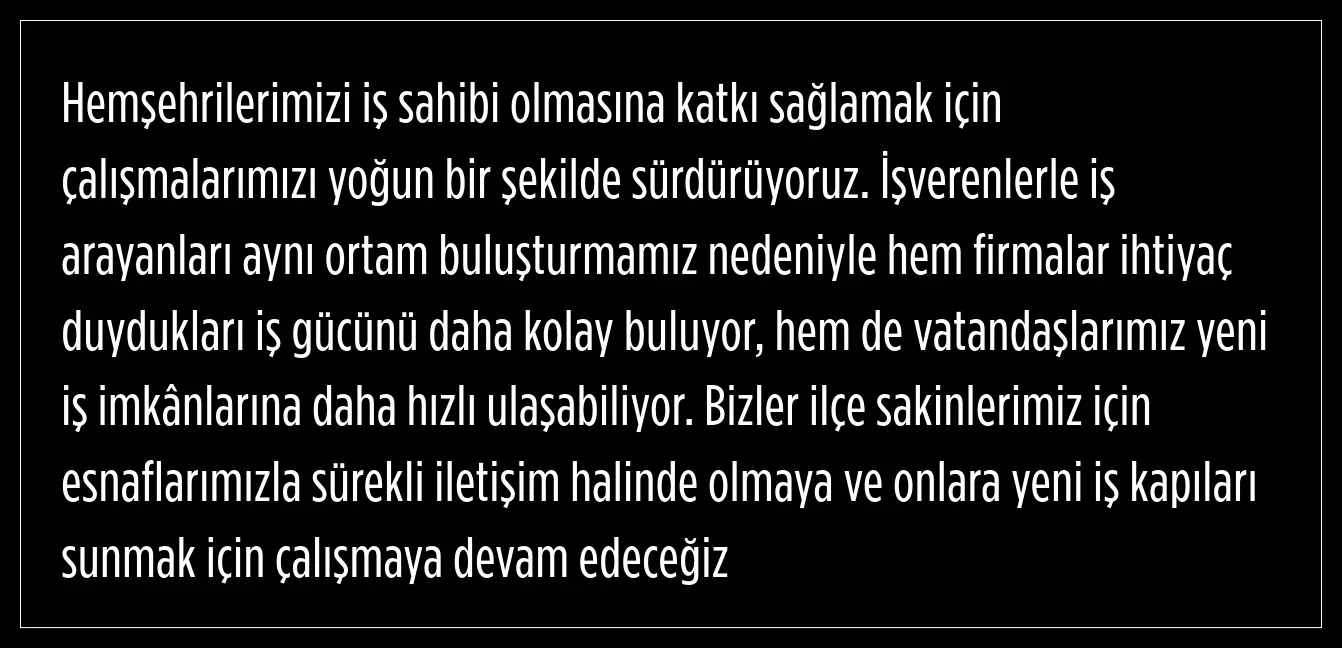 İşverenlerle iş arayanları aynı ortam buluşturma nedeniyle hem firmaların ihtiyaç duydukları iş gücünü daha kolay bulduğunu, hem de vatandaşların yeni iş imkânlarına daha hızlı ulaşabildiğini aktaran Ertuğrul Çetin, esnafla sürekli iletişim halinde olmaya ve onlara yeni iş kapıları sunmak için çalışmaya devam edeceklerini belirtti.