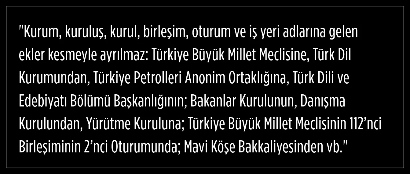 Türk Dil Kurumunun resmî internet sitesinde bulunan YAZIM KILAVUZU başlığı altındaki Kesme İşareti ( ’ ) konusunda, söz konusu işaretin kullanımıyla ilgili önemli bir ayrıntı bulunuyor. İstisna durumları içeren bu kuralda Türk Dil Kurumu şöyle diyor: