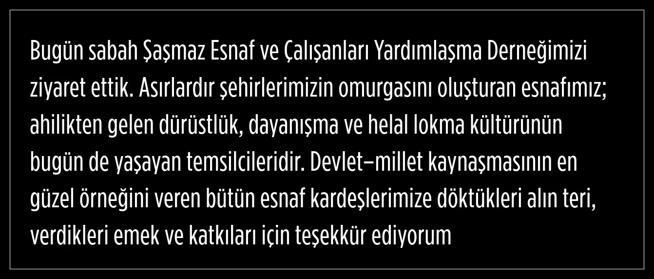 Yerlikaya, asırlardır şehirlerin omurgasını oluşturan esnafın; ahilikten gelen dürüstlük, dayanışma ve helal lokma kültürünün bugün de yaşayan temsilcileri olduğunu ifade etti.