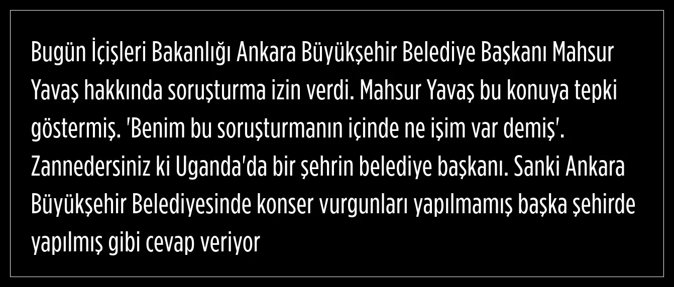 Ankara Büyükşehir Belediyesine (ABB) yönelik geçtiğimiz aylarda 2021-2024 yılları arasında belediye tarafından organize edilen konserlerde yapılan harcamaların “kamu zararına yol açtığı” iddiasıyla soruşturma başlatıldı.