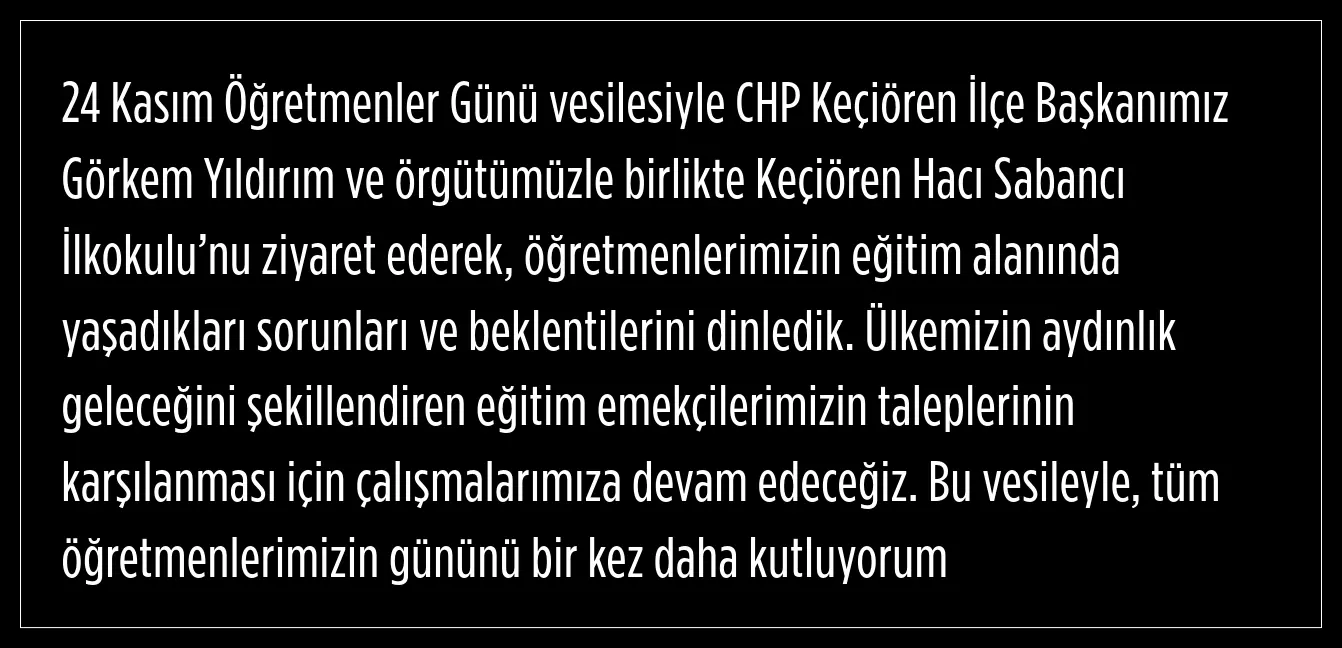 Semra Dinçer, 24 Kasım dolayısıyla Keçiören Hacı Sabancı İlkokulu’nu ziyaret etti. Dinçer, ''Öğretmenlerimizin sorunları ve beklentilerini dinledik. '' dedi.