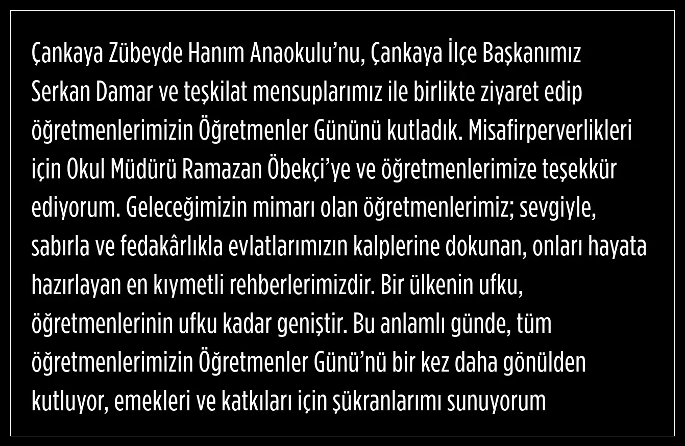 MHP'li Ankara Milletvekili Mevlüt Karakaya, 24 Kasım dolayısıyla Çankaya Zübeyde Hanım Anaokulu’nu ziyaret etti ve öğretmenlerle bir araya geldi.