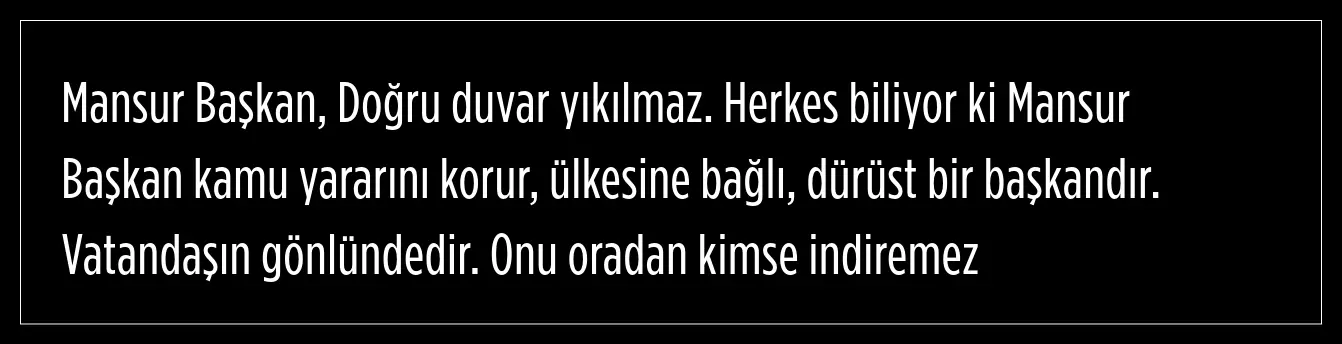 Doğru duvarın yıkılmayacağını ifade eden Karalar, Mansur Yavaş'ın kamu yararını koruduğunu, ülkesine bağlı olduğunu ve dürüst bir başkan olduğunu söyledi.