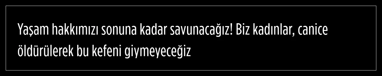 "Biz kadınlar, canice öldürülerek bu kefeni giymeyeceğiz)"