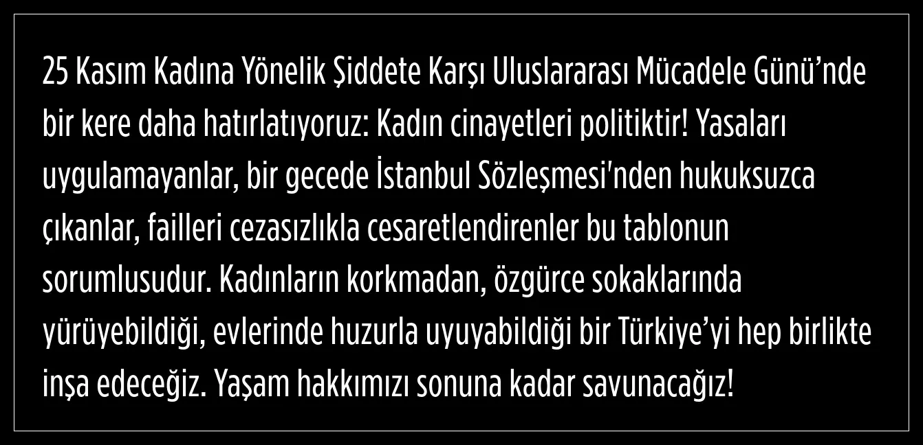 Dinçer, yasaları uygulamayanların, bir gecede İstanbul Sözleşmesi'nden hukuksuzca çıkanların, failleri cezasızlıkla cesaretlendirenlerin bu tablonun sorumlusu olduğunu kaydetti.