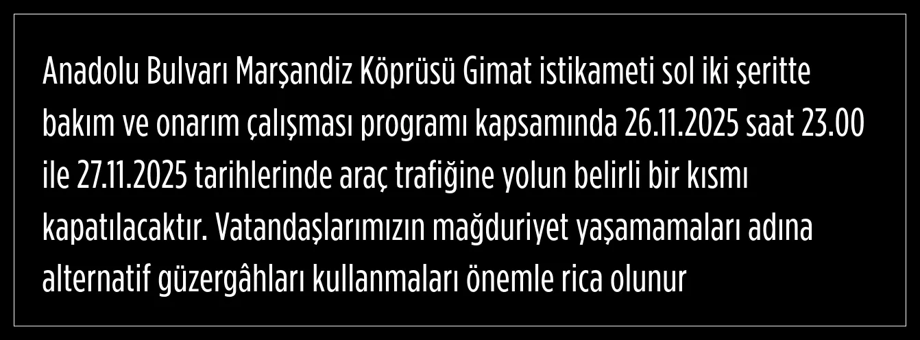 Bu nedenle 26.11.2025 saat 23.00 ile 27.11.2025 tarihlerinde yolun belirli bir kısmının araç trafiğine kapatılacağını duyurdu.