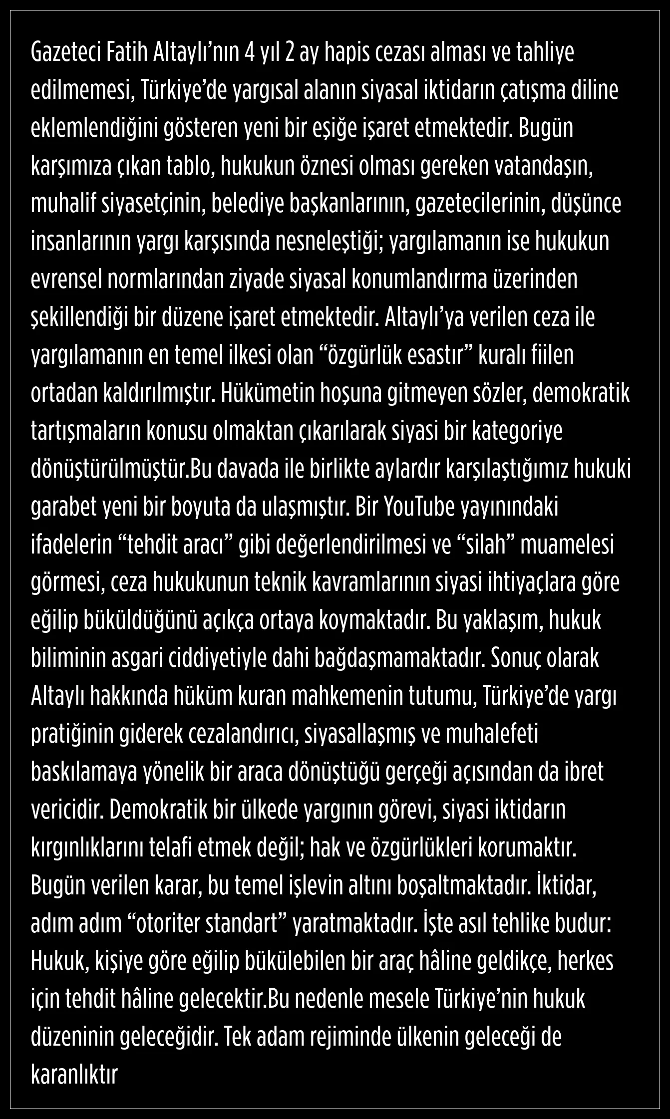 Taşcıer, Fatih Altaylı’nın 4 yıl 2 ay hapis cezası almasının, tahliye edilmemesinin Türkiye’de yargısal alanın siyasal iktidarın çatışma diline eklemlendiğini gösteren yeni bir eşiğe işaret ettiğini aktardı.