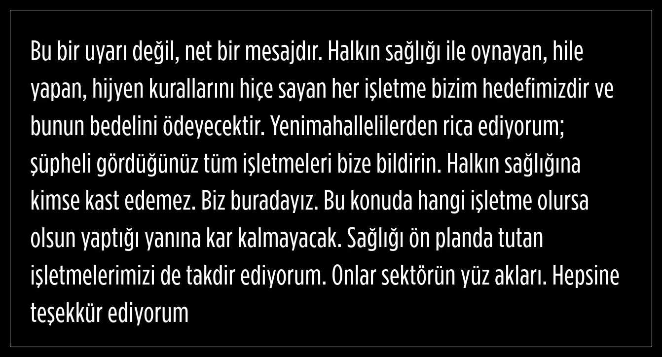 "Yenimahalle’de hiçbir işletme vatandaşı zehirleyemez, kandıramaz veya vatandaşa sağlıksız ürünleri serbestçe sunamaz" diyen Fethi Yaşar, bu şekilde hizmet sunan işletmelere aflarının olmadığını, derhal kapatılacağını ve sorumluların hukuk önünde hesap vereceğini aktardı.
