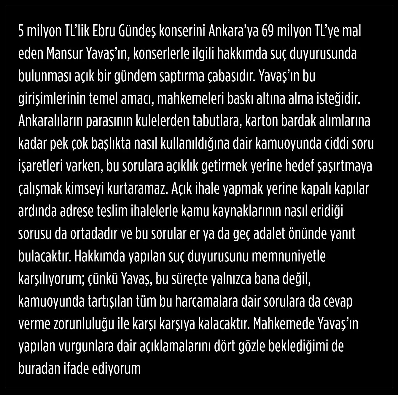 Sosyal medya hesabı üzerinden yazılı bir paylaşım yapan Gökçek, Yavaş'ın konserlerle ilgili hakkında suç duyurusunda bulunmasının açık bir gündem saptırma çabası olduğunu kaydetti.