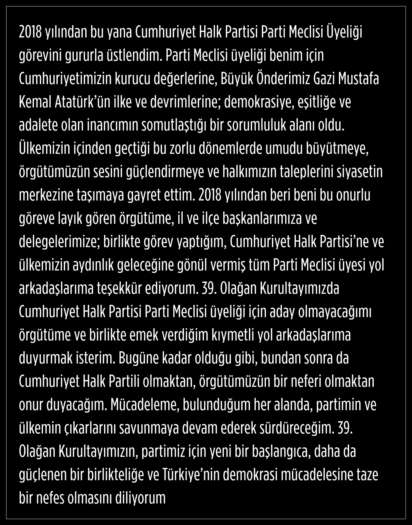 Parti Meclisi üyeliğinin kendisi için Cumhuriyet'in kurucu değerlerine, Gazi Mustafa Kemal Atatürk’ün ilke ve devrimlerine; demokrasiye, eşitliğe ve adalete olan inancının somutlaştığı bir sorumluluk alanı olduğunu, ülkenin geçtiği bu zorlu dönemlerde umudu büyütmeye, örgütün sesini güçlendirmeye ve halkın taleplerini siyasetin merkezine taşımaya gayrete ettiğini kaydetti.