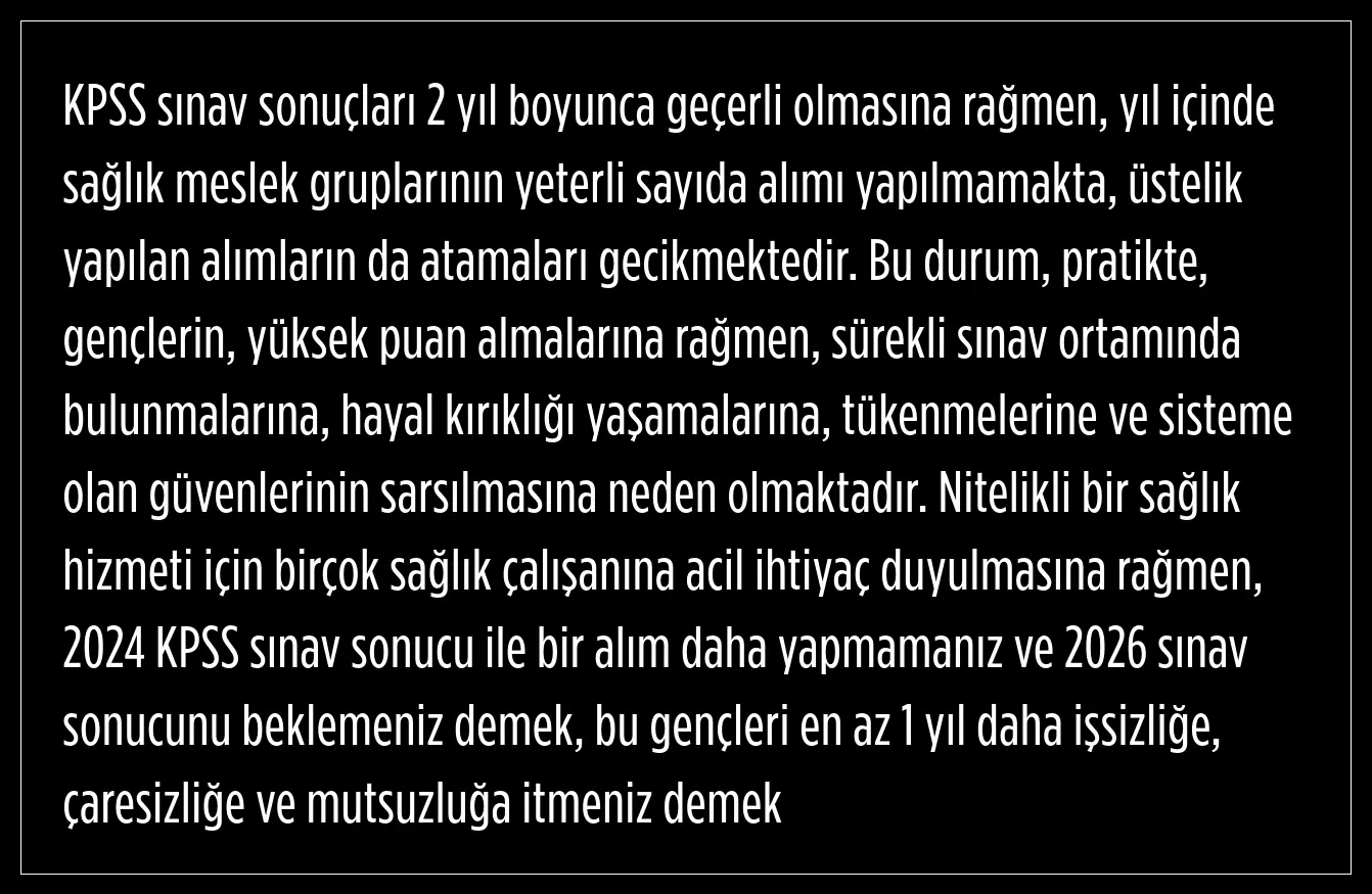Yaman, KPSS sınav sonuçlarının 2 yıl boyunca geçerli olmasına rağmen yıl içerisinde sağlık meslek gruplarının yeterli sayıda alımının yapılmadığını, yapılan alımların da atamalarının da geciktiğini söyledi.