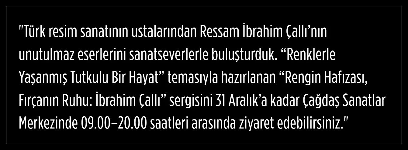 “Rengin Hafızası, Fırçanın Ruhu: İbrahim Çallı” sergisi, 31 Aralık’a kadar Çağdaş Sanatlar Merkezi’nde 09.00–20.00 saatleri arasında ziyaret edilebilecek.