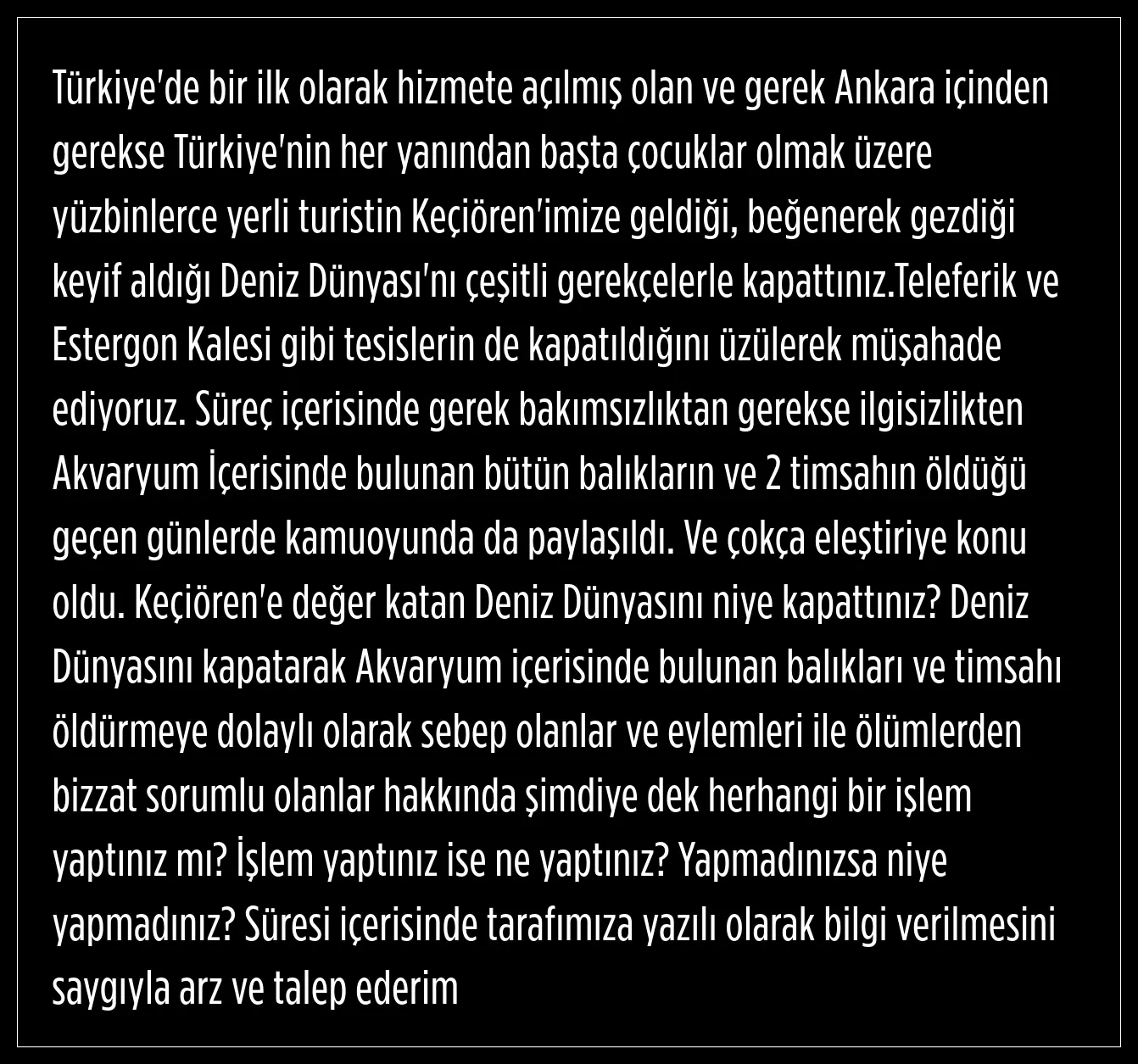 Ünal, süreç içerisinde gerek bakımsızlıktan gerekse ilgisizlikten akvaryum İçerisinde bulunan bütün balıkların ve 2 timsahın öldüğünün geçtiğimiz günlerde kamuoyuna paylaşıldığını ve çokça eleştiriye konu olduğunu söyledi.