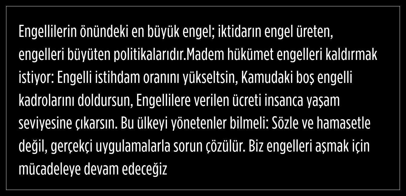 Ersever, engellilerin önündeki en büyük engelin, iktidarın engel üreten, engelleri büyüten politikaları olduğunu söyledi.