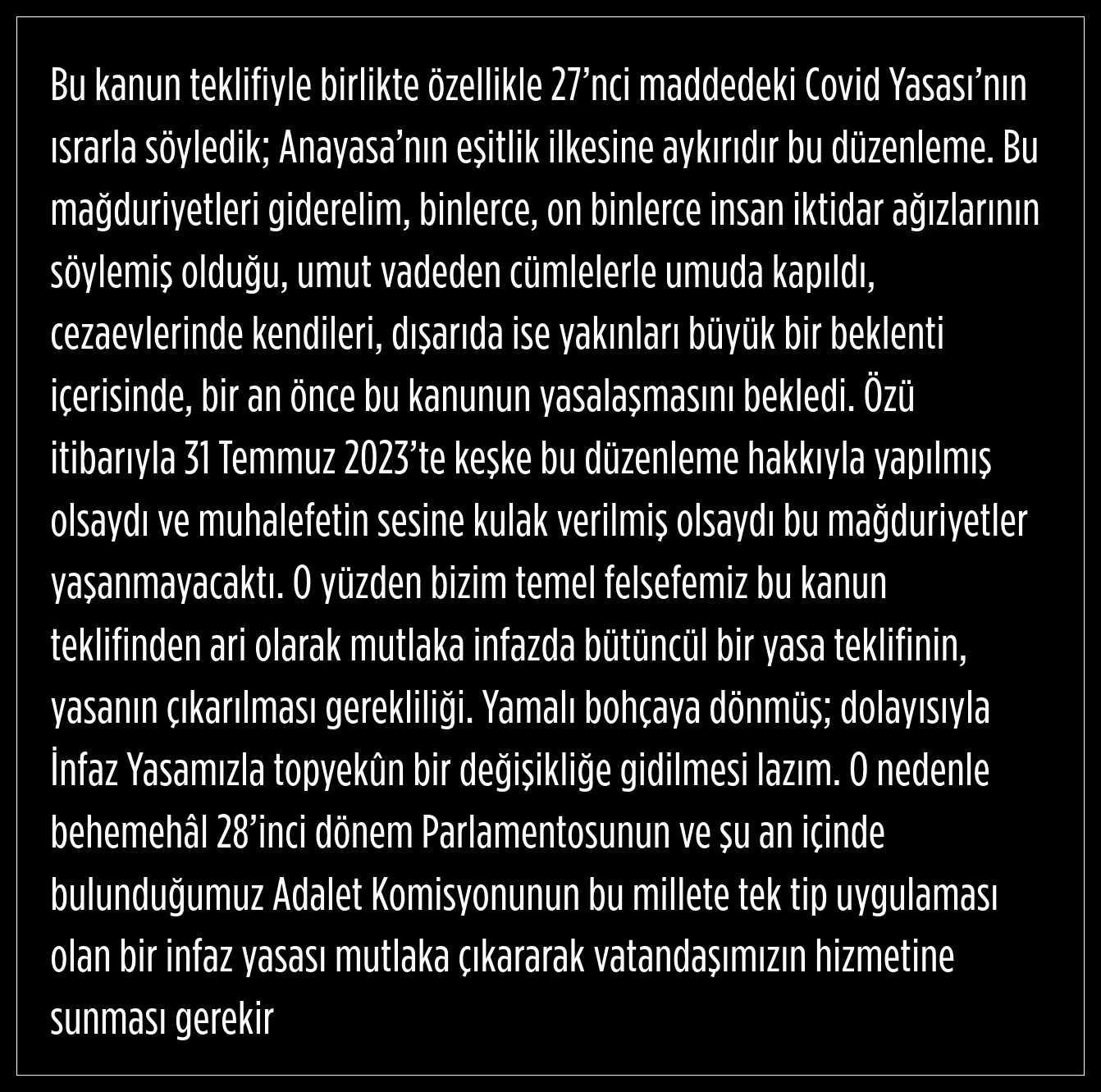 Covid Yasası'nın Anayasanın eşitlik ilkesine aykırı olduğunu bir kez daha kaydeden İdris Şahin, infaz yasası çıkarılması çağrısında bulundu.