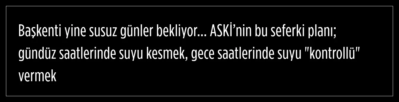 Geçtiğimiz günlerde su krizi yeniden baş gösterdi. Ankara Su ve Kanalizasyon İdaresi (ASKİ) şehir genelindeki içme suyu hatlarında oluşan arızalar ve yürütülen çalışmalar nedeniyle planlı su kesintileri yapılacağını bildirdi.