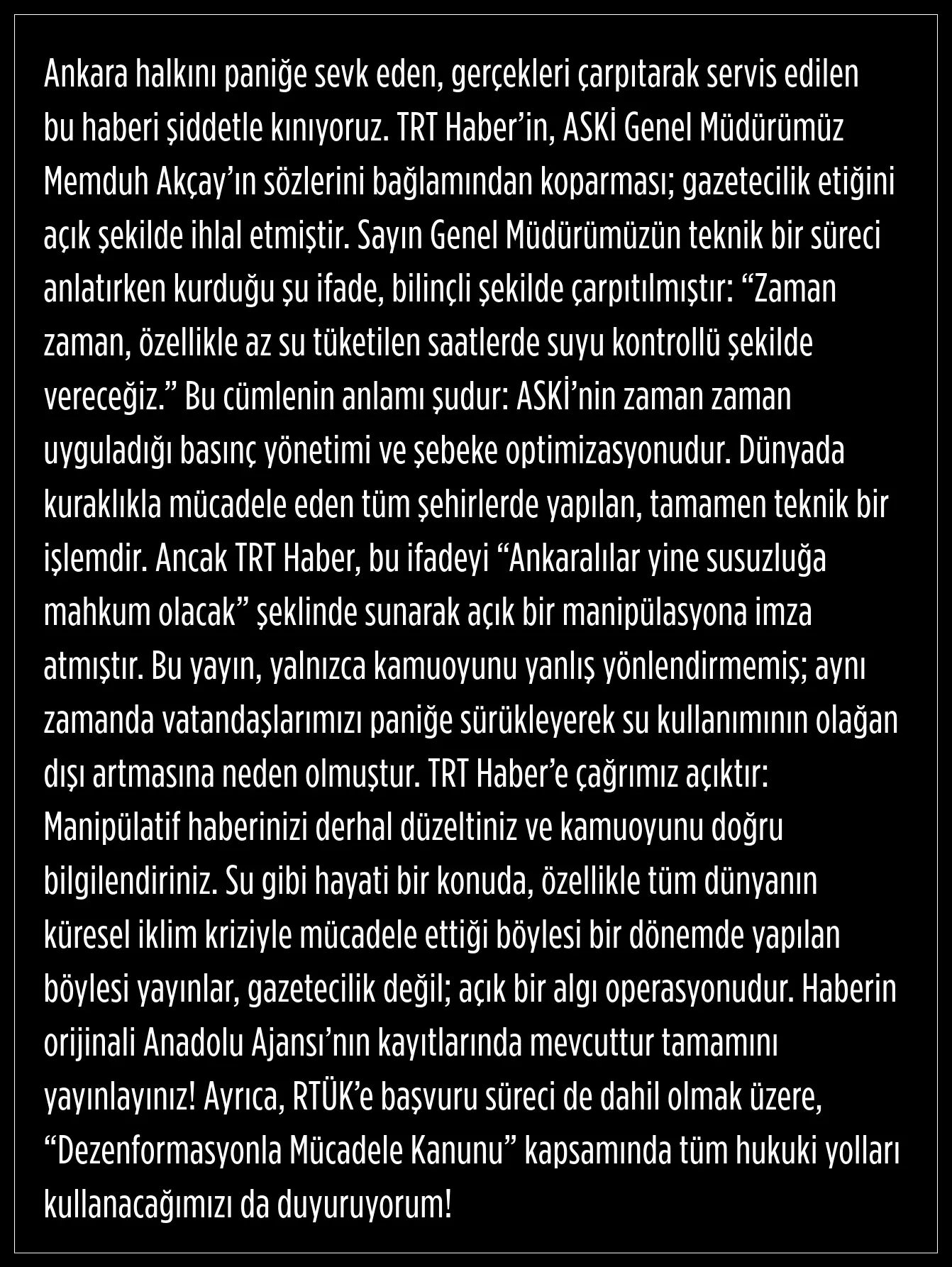TRT, Ankara'daki su kesintileriyle ilgili bir haber yaptı. Haberde, şu ifadelere yer verildi: