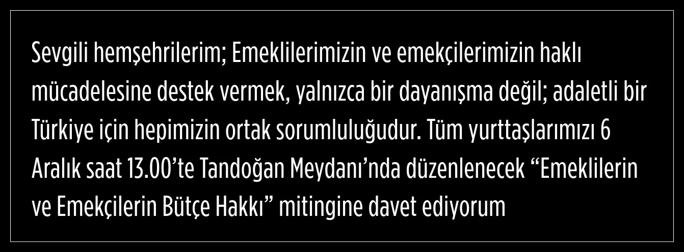 Ankara Büyükşehir Belediye Başkanı Mansur Yavaş, 6 Aralık'ta Tandoğan Meydanı’nda yapılacak “Emeklilerin ve Emekçilerin Bütçe Hakkı” mitingine davet etti.