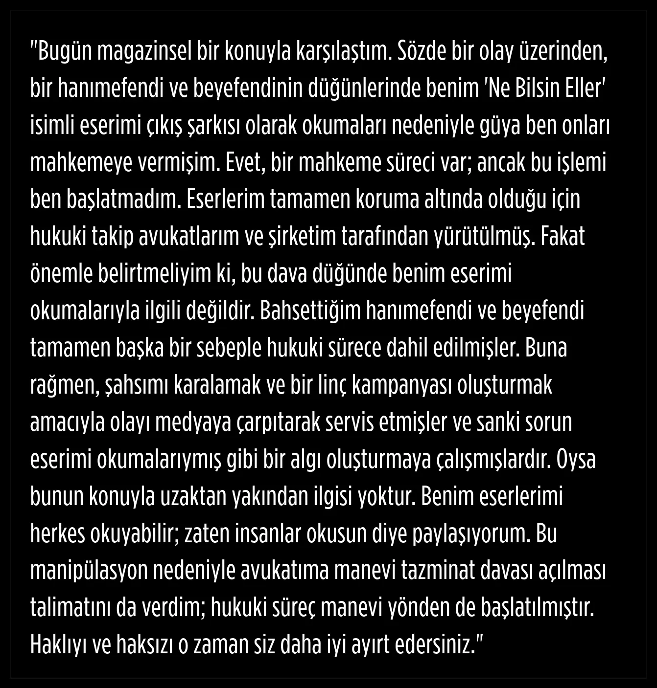 Sanatçı, kendisi hakkında “linç girişimi” başlatıldığını savunarak manipülatif paylaşım yaptığını düşündüğü kişiler hakkında avukatına manevi tazminat davası açılması talimatını verdiğini, hukuki sürecin manevi yönden de başlatıldığını açıkladı.