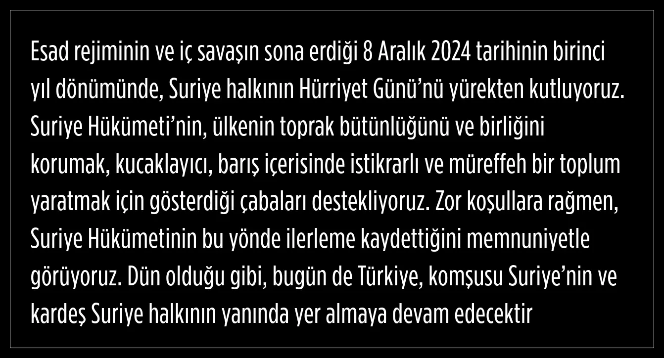 Sosyal medya hesabı üzerinden bir paylaşım yapan Fuat Oktay, birinci yıl dönümünde, Suriye halkının Hürriyet Günü’nü yürekten kutladıklarını ifade etti.