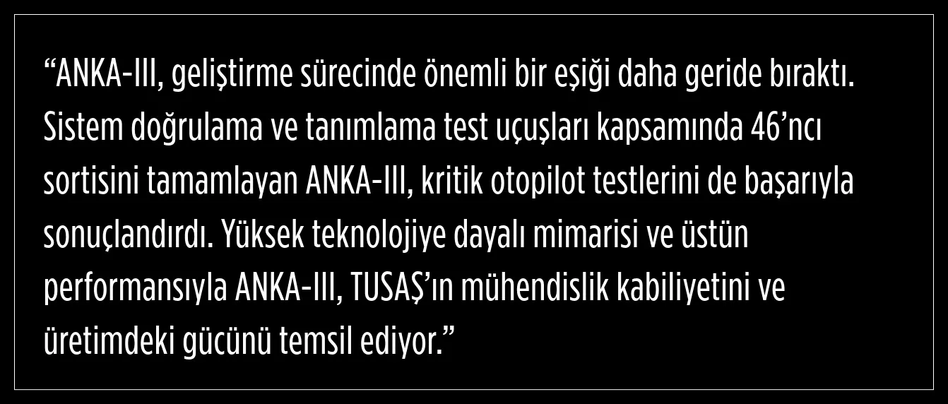 Merkezi Ankara'nın Kahramankazan ilçesinde, Akıncı bölgesinde yer alan Türk Havacılık ve Uzay Sanayii-TUSAŞ'ın insansız hava aracı projeleri arasında önemli bir yere sahip olan ANKA-III, Ankara’da yürütülen test programı kapsamında 46’ncı sortisini tamamladı ve bu uçuşla birlikte kritik otopilot değerlendirmelerini başarıyla geride bıraktı. Sistem doğrulama ve tanımlama uçuşlarının devam ettiği süreçte elde edilen sonuçların, ilerleyen aşamalara yönelik önemli veri sağladığı bildirildi.