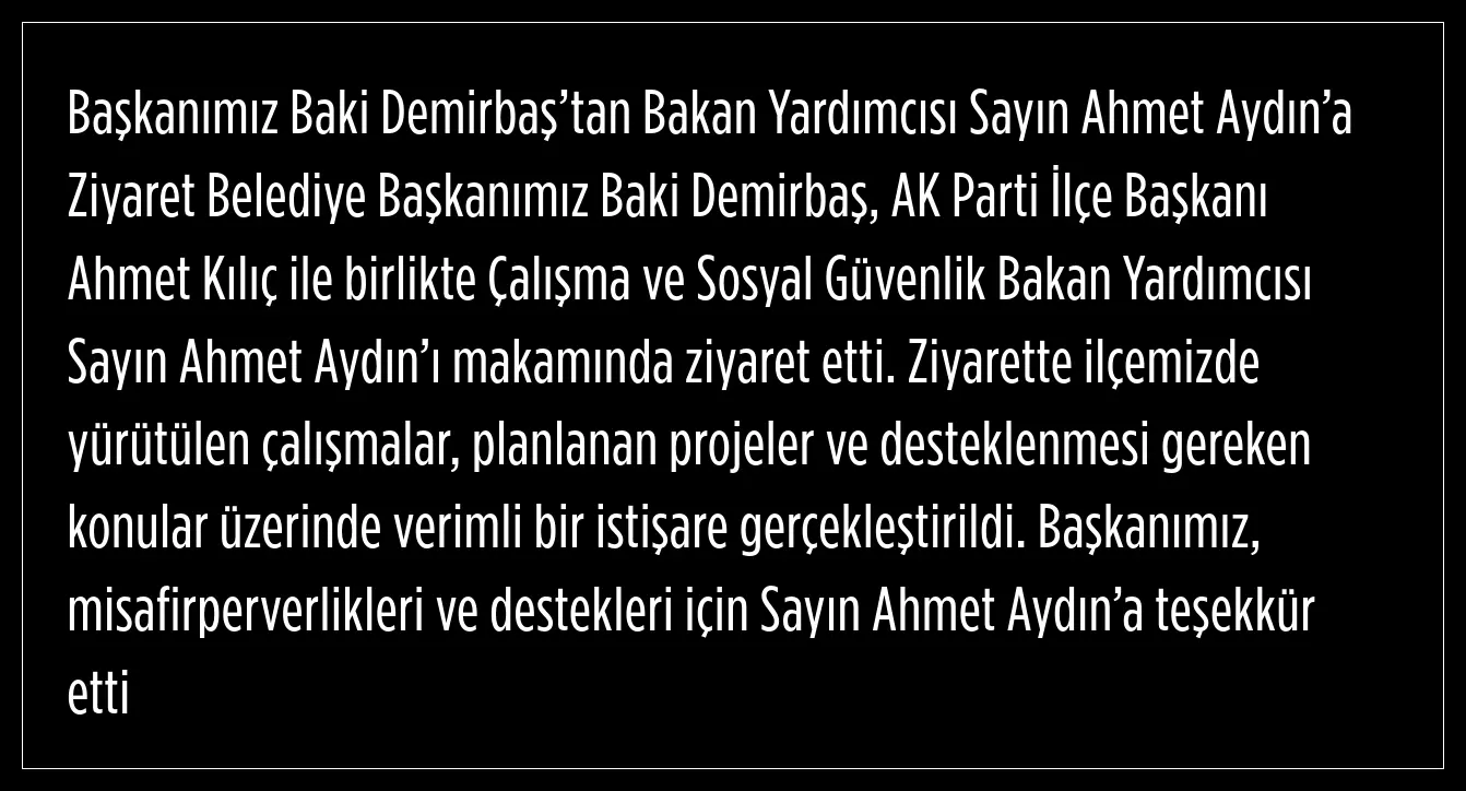 Sosyal medya hesabı üzerinden ziyarete ilişkin paylaşım yapan Demirbaş, Ahmet Aydın'ı makamında ziyaret etti. Demirbaş'a AK Parti İlçe Başkanı Ahmet Kılıç da eşlik etti.