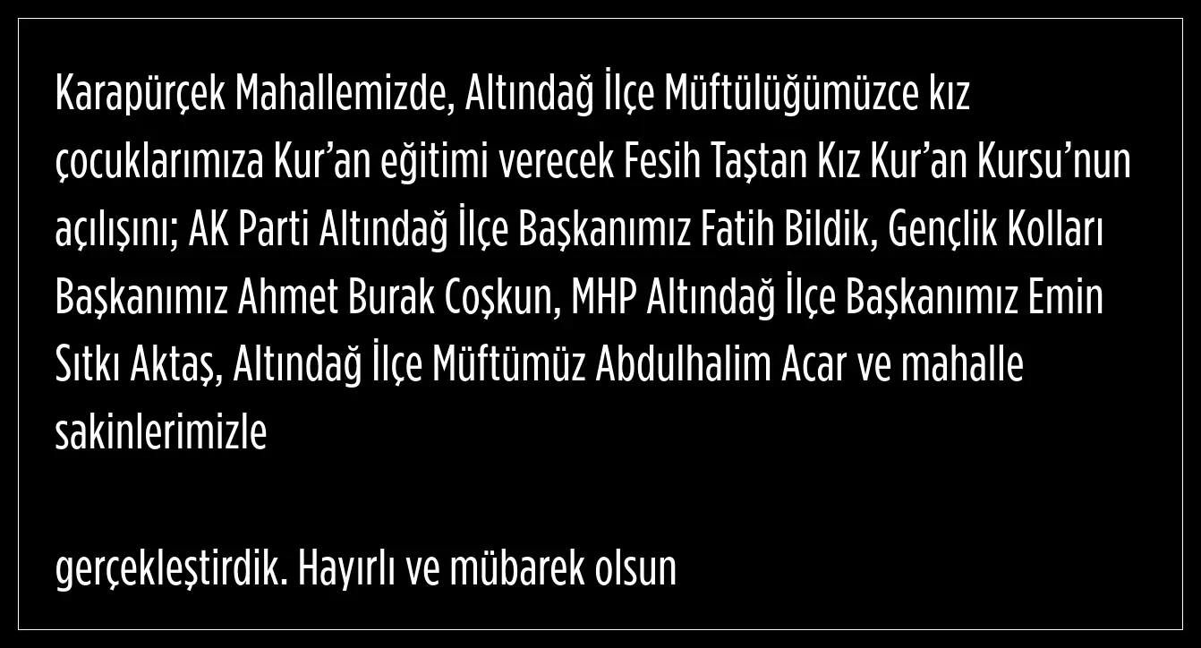 Altındağ İlçe Müftülüğünce Karapürçek Mahallesi'nde yer alan Fesih Taştan Kız Kur’an Kursu, Altındağ Belediye Başkanı Veysel Tiryaki, siyasetçiler ve vatandaşların katılımıyla açıldı.