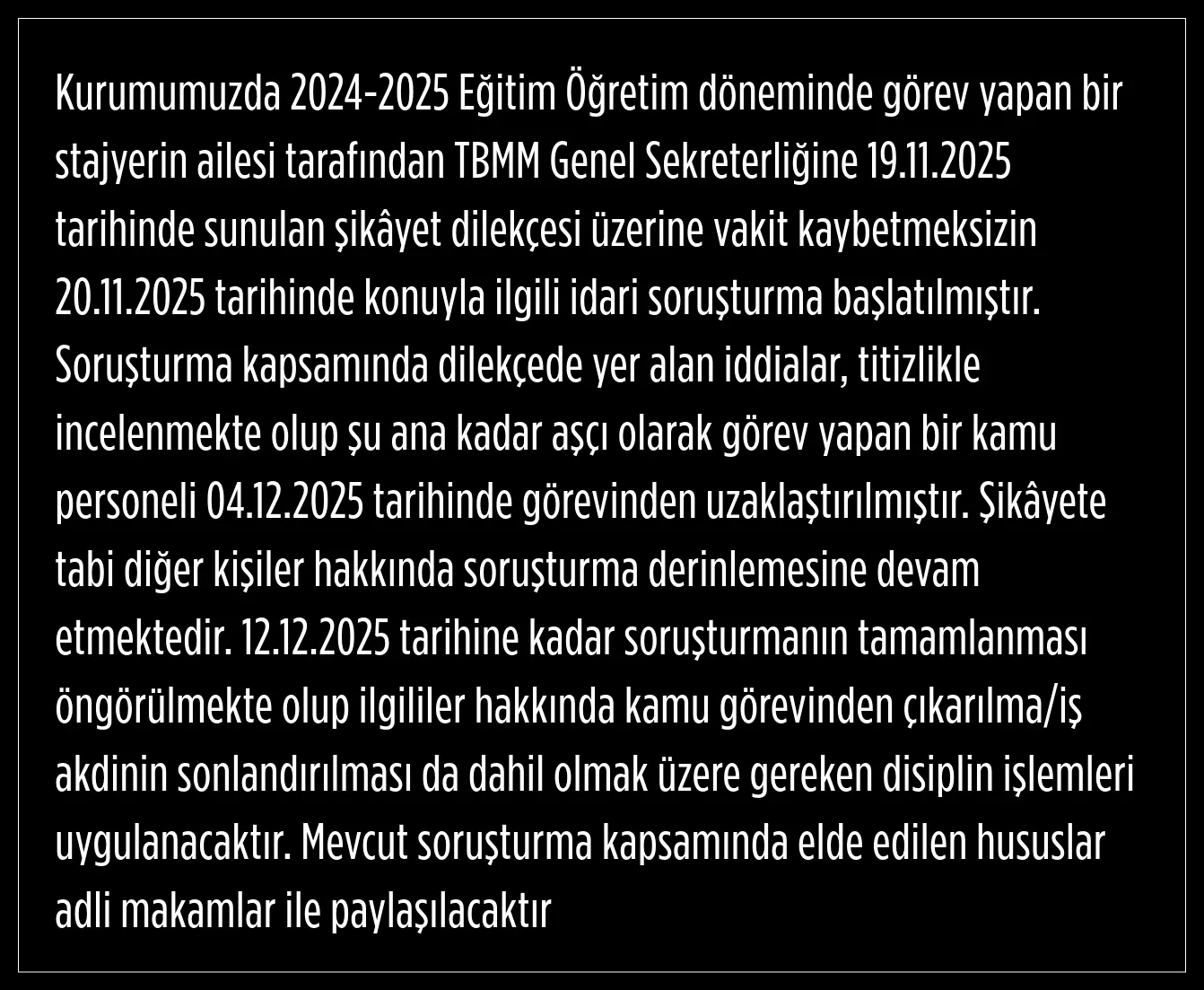 Açıklamada, stajyerin ailesi tarafından 19 Kasım'da sunulan şikâyet dilekçesi üzerine vakit kaybetmeksizin 20 Kasım tarihinde konuyla ilgili idari soruşturma başlatıldığı aktarıldı.