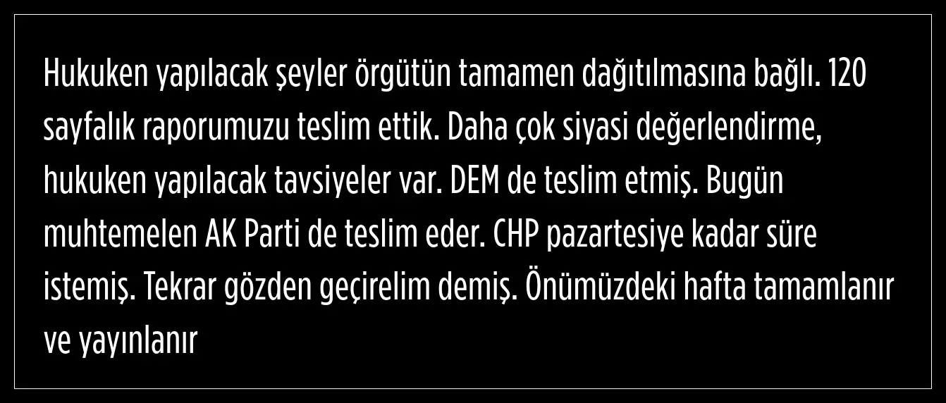 120 sayfalık raporu teslim ettiklerini söyleyen Yıldız, raporda daha çok siyasi değerlendirme ve hukuken yapılacak tavsiyeler olduğunu belirtti.