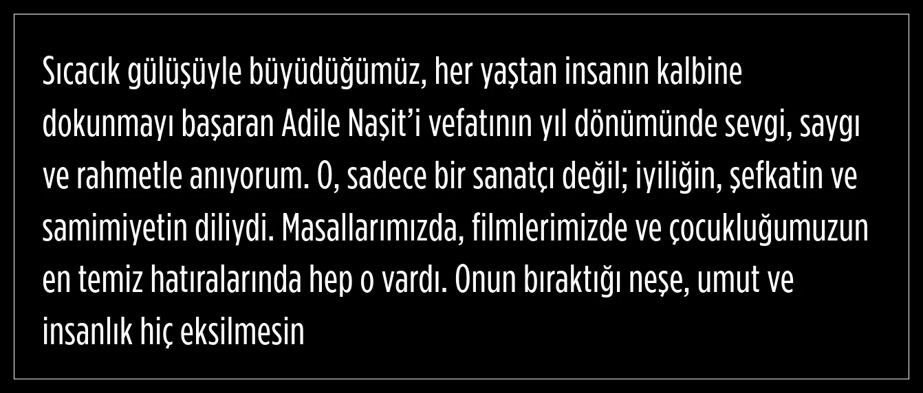 "Sıcacık gülüşüyle büyüdüğümüz, Adile Naşit’i sevgi, saygı ve rahmetle anıyorum"