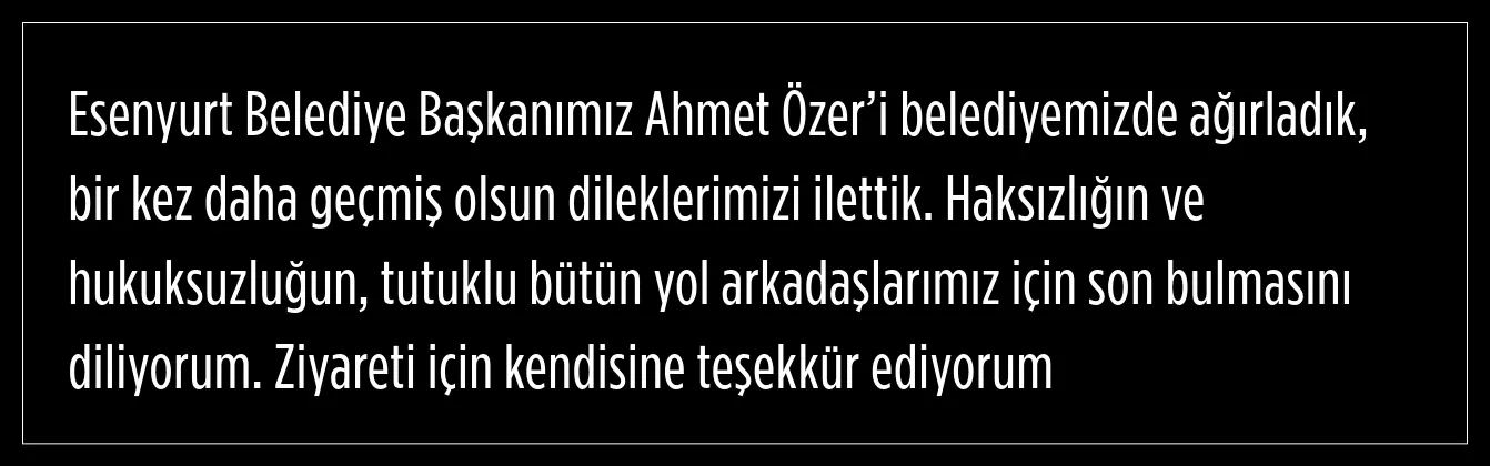 Geçtiğimiz haftalarda cezaevinden tahliye olan eski Esenyurt Belediye Başkanı Ahmet Özer, Çankaya Belediye Başkanı Hüseyin Can Güner'e bir ziyarette bulundu.