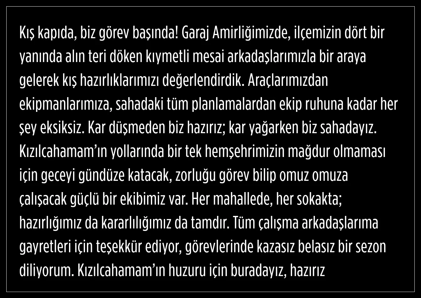 Kızılcahamam'da kış öncesi hazırlıklarını tamamladı. Başkan Acar, sahaya inerek çalışmaları yerinde inceledi. Acar, vatandaşların mağdur olmaması için gece gündüz çalışacaklarını kaydetti.
