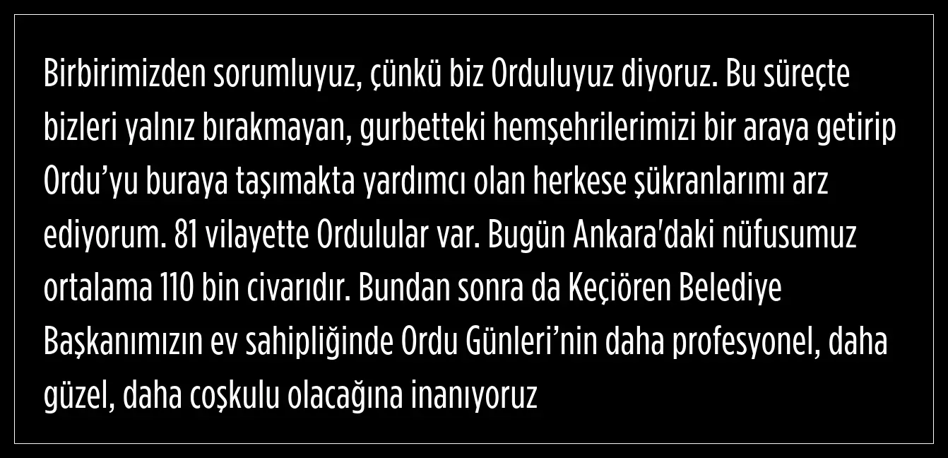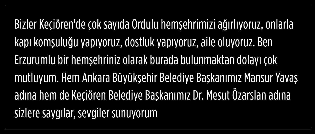 Ordulularla Keçiörenlilerin bir araya gelmesine vesile olan Keçiören Belediye Başkanı Mesut Özarslan'a teşekkürlerini ileten Keçiören Belediye Başkanvekili Tolga Turgut, Ordu günlerinin yapılması için gerekli emeğin, çabanın ve mücadelenin verilmesinde pay sahibi olan herkese teşekkürlerini ilettiğini aktardı. Turgut, şunları söyledi: