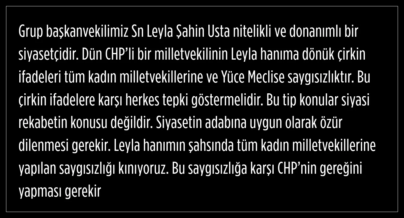 AK Partili Çelik, Leyla Şahin Usta'nın şahsında tüm kadın milletvekillerine yapılan saygısızlığı kınadıklarını ve bu saygısızlığa karşı CHP'nin gereğini yapması gerektiğini söyledi.