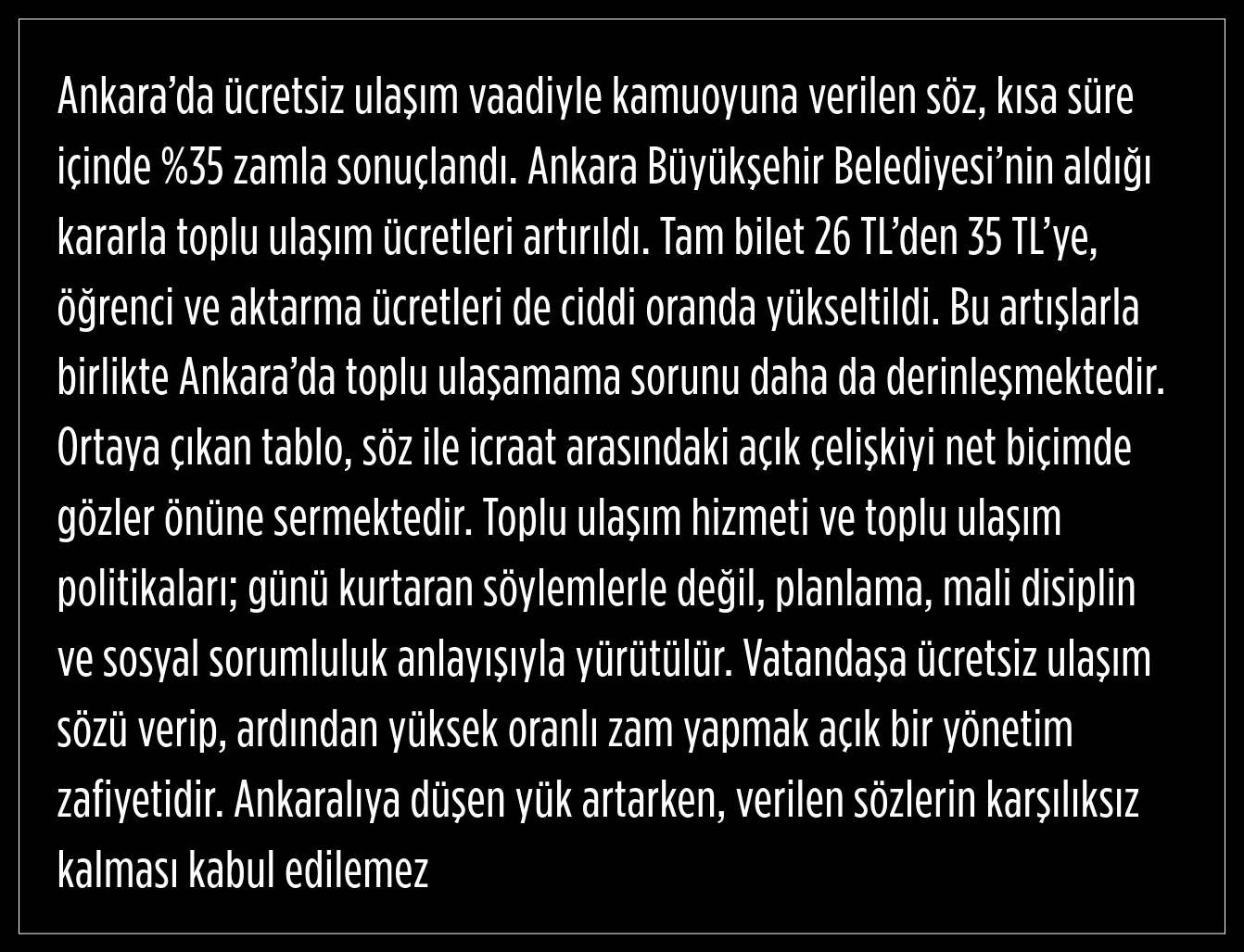 Sarıeroğlu, vatandaşa ücretsiz ulaşım sözü verilip, ardından yüksek oranlı zam yapılmasının açık bir yönetim zafiyeti olduğunu belirtti.