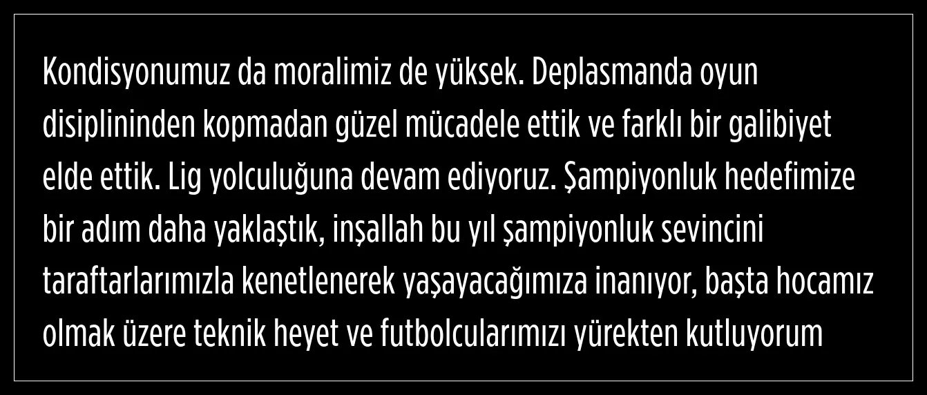 Ligin zorluk seviyesinin farkında olduklarını söyleyen Teknik Direktör Ahmet Uçar, kondisyonlarının her geçen gün artmaya devam ettiğini kaydetti. Disiplinli çalışmanın meyvesini galibiyetle almanın mutluluk verici olduğunu ifade eden Uçar, morallerinin yüksek olduğunu belirtti. Ahmet Uçar, şampiyon olaraklarını ve kupayı Kahramankazan’a getireceklerini kaydetti.